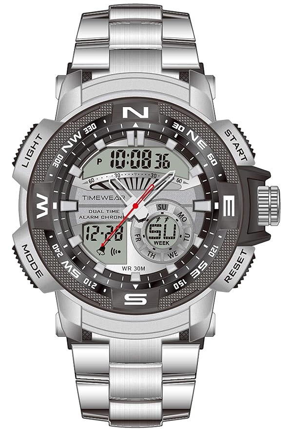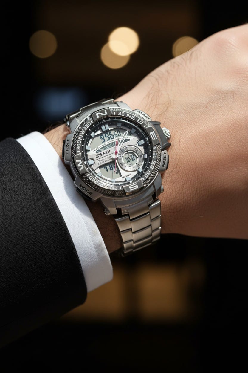 ساعة قوية بتصميم رياضي عصري، تجمع بين الأناقة والوظائف العملية، مناسبة للاستخدام اليومي والرياضي.