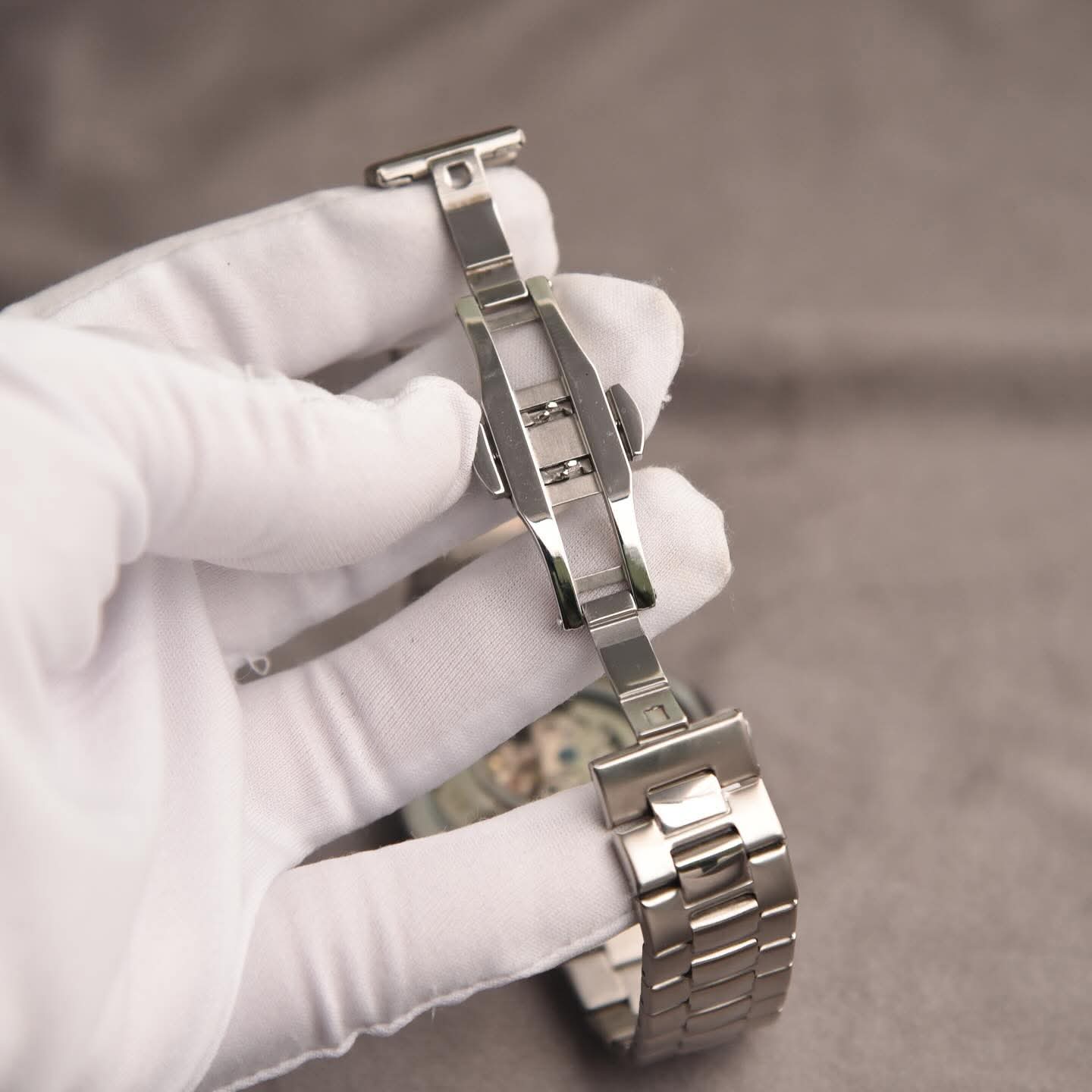 هيكل وسوار من الفولاذ المقاوم للصدأ بلمسة فضية أنيقة.